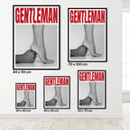 A man’s hand forms a high heel beneath a woman’s foot iconic black white poster bold red Gentleman text modern art for statement lovers.