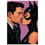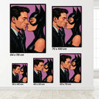 Pop art illustration shows man in black suit with Catwoman tenderly touching lips a creative romantic piece full of bold vibrant energy.